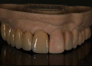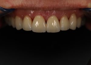 Door een ongeluk waren bij deze patiënt de fronttanden afgebroken. Uiteindelijk is er voor gekozen om 3 tanden te vervangen voor kronen. Door een goede kleurbepaling met foto's kunnen wij de restdentitie goed bestuderen en zoveel mogelijk details laten terugkomen in de uiteindelijke opgebakken kronen. 11 t/m 22 losse kronen opgebakken porselein.